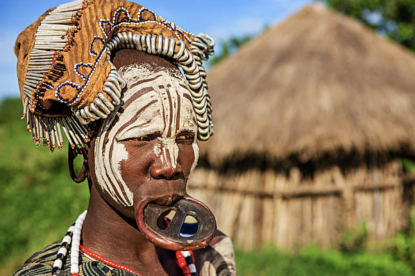 In Ethiopia’s Mursi tribe, the lip plate—or labret—is one of the most iconic and visually striking beauty practices in the world. Beginning before puberty, young girls have their lower lip pierced so a small wooden plug can be inserted. Over time, the plug is replaced by larger clay discs, stretching the lip to dramatic proportions. Despite its intense appearance, the lip plate represents beauty, social status, adulthood, and cultural pride among the Mursi.