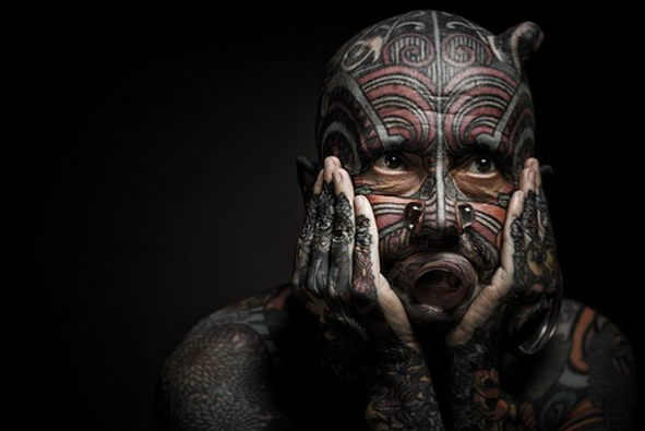 Etienne Dumont, a Swiss journalist and art critic, turned his passion for art into his body. Fully tattooed, he also sports large piercings and lip expanders that make him instantly recognizable. Known for his eccentric style and bold appearance, Dumont stands out even in artistic circles. For him, tattoos aren’t just decoration but a statement of identity, blurring the line between critic and living artwork.